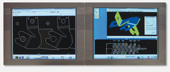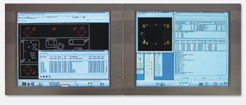 Bohrungen setzen und den automatisch generierten Bohrplan auf dem linken Bildschirm sehen. Rechts werden Bearbeitungsfolge und NC-Programm verifiziert, wobei die Menüs keine Grafik verdecken. Die vergleichsweise kleine Fläche eines Bildschirms wird durch CADDA-PowerView verdoppelt und die hohe Auflösung pro Bildschirm kostengünstig genutzt.