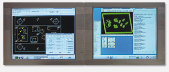 Gesamtdarstellung als Ansicht oder Schnitt, Draufsicht einer Platte und Liste der Ebenen oder Dialogboxen auf dem rechten Bildschirm. Links die bildschirmfüllende Detailkonstruktion. Diese übersichtliche Arbeitsweise auf 2 Bildschirmen führt zu hoher Effizienz und Fehlerfreiheit.