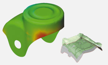 - FEM-Netzgenerierung für ein- oder mehrstufige Abwicklung und Umformung von 3D-Teilen einschließlich Niederhalter, Ziehwulst, Flansche, Rückfederung, etc.